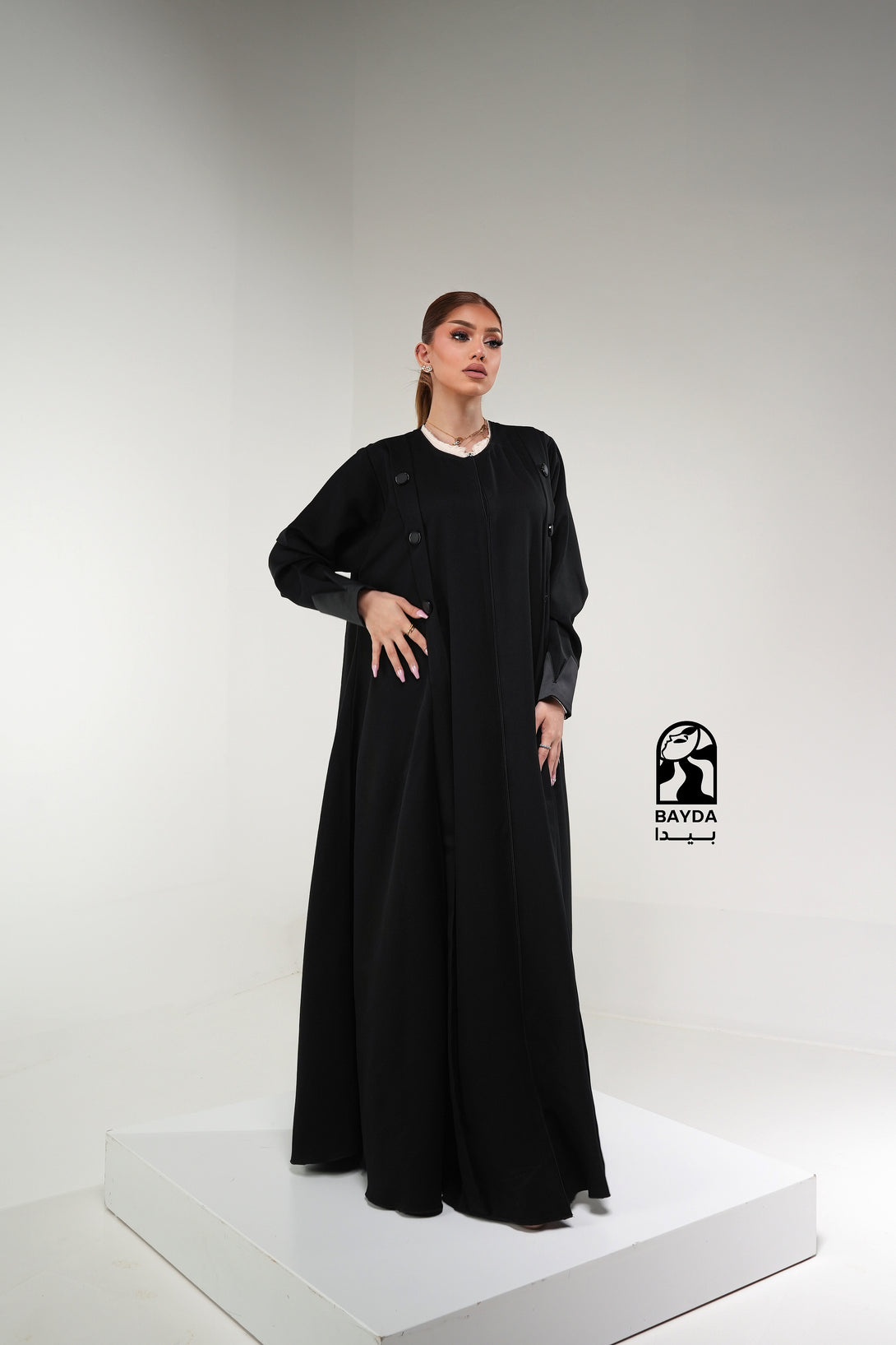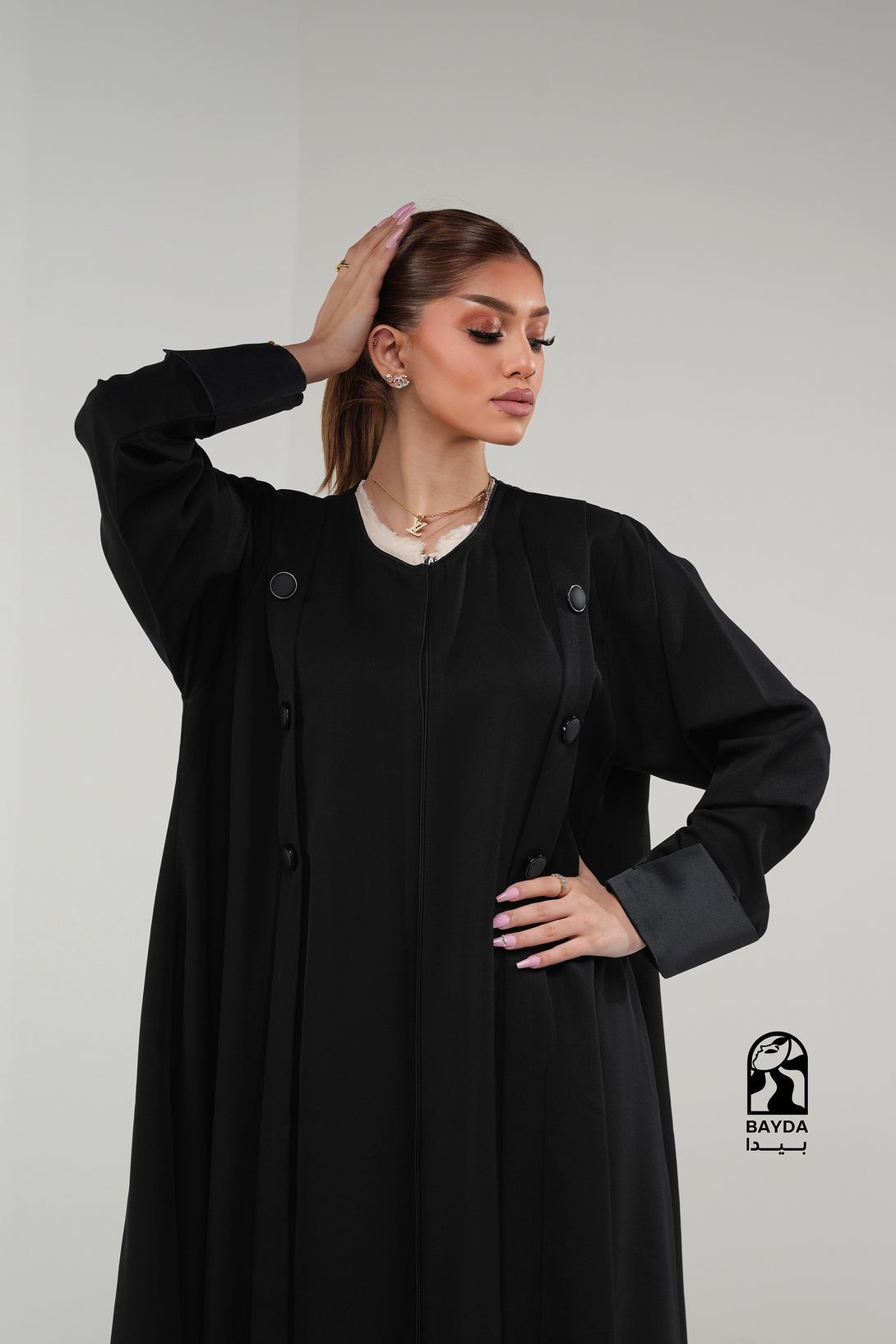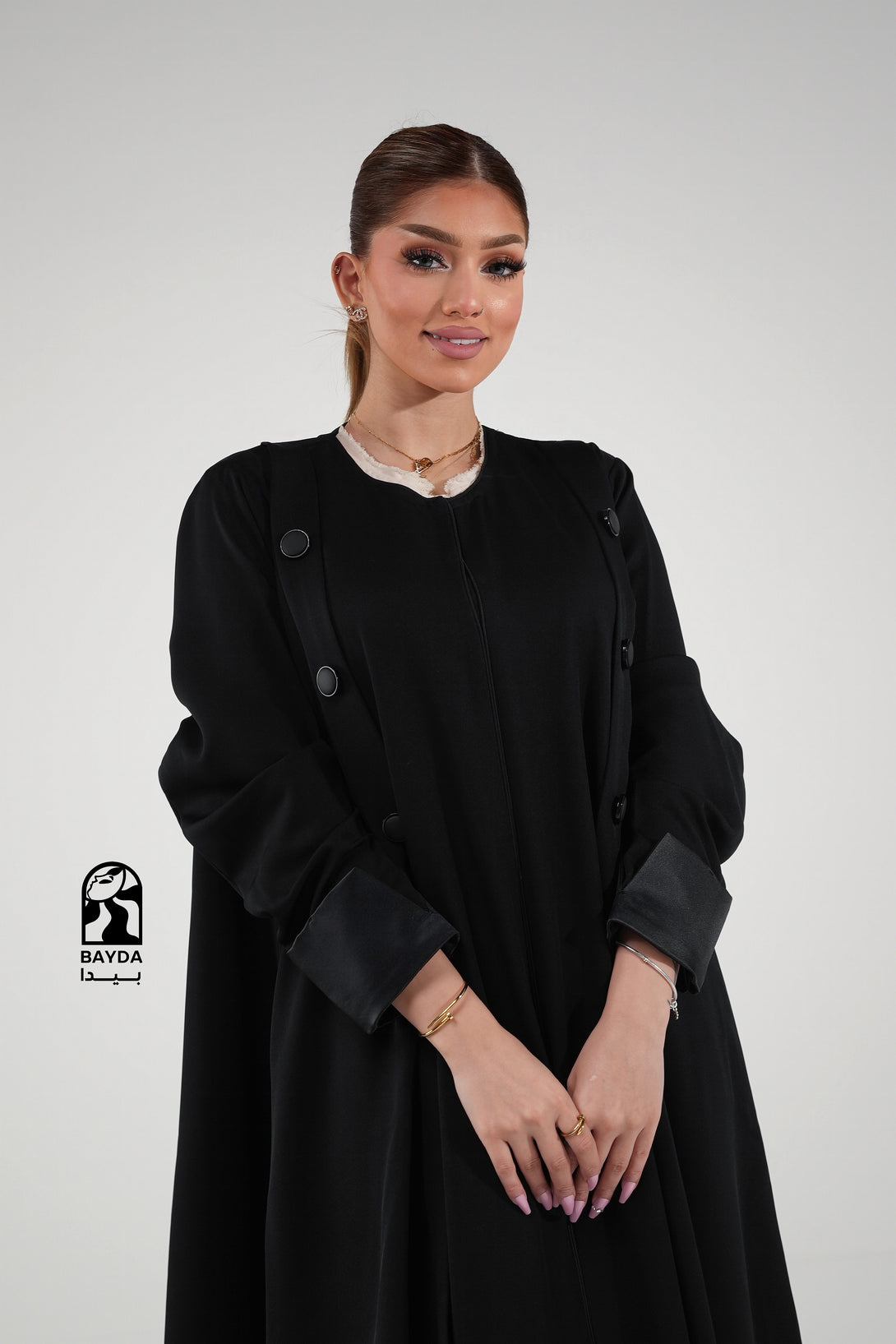 تصميم عصري: تتميز العباية بقَصَّة عملية وراقية مع تفاصيل أزرار على الأكمام، مما يجعلها مثالية للإطلالات الرسمية واليومية المميزة.
