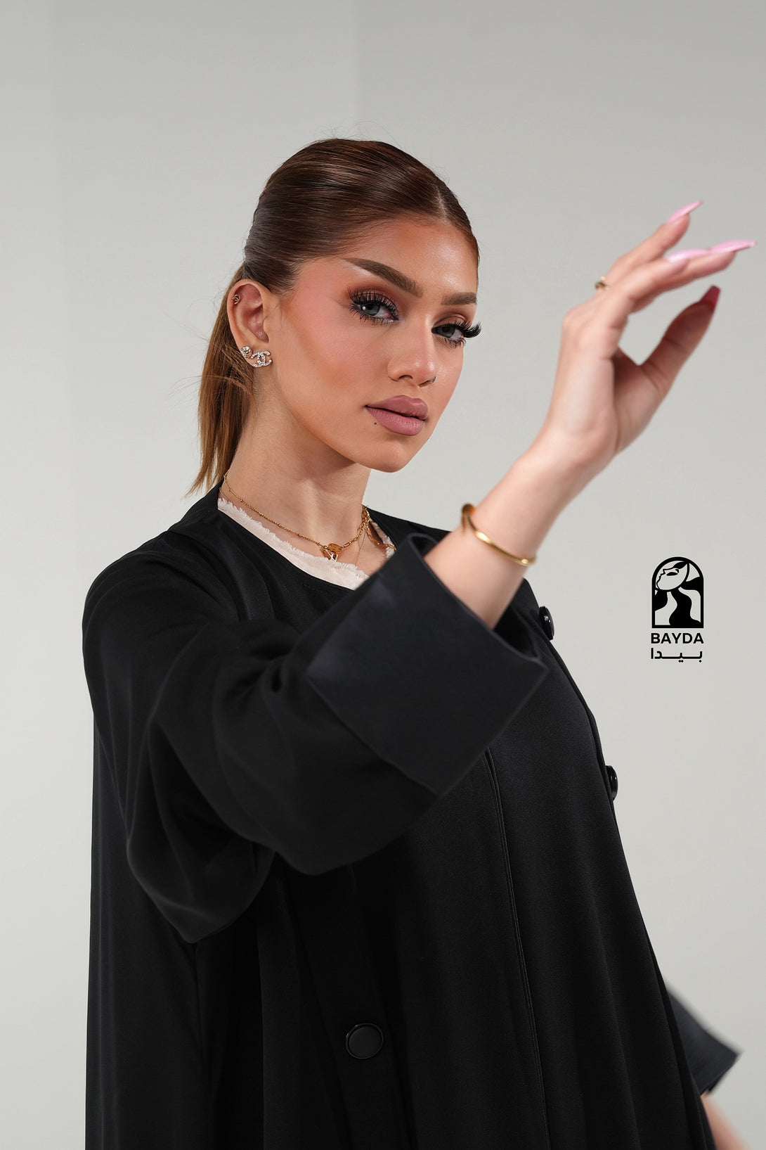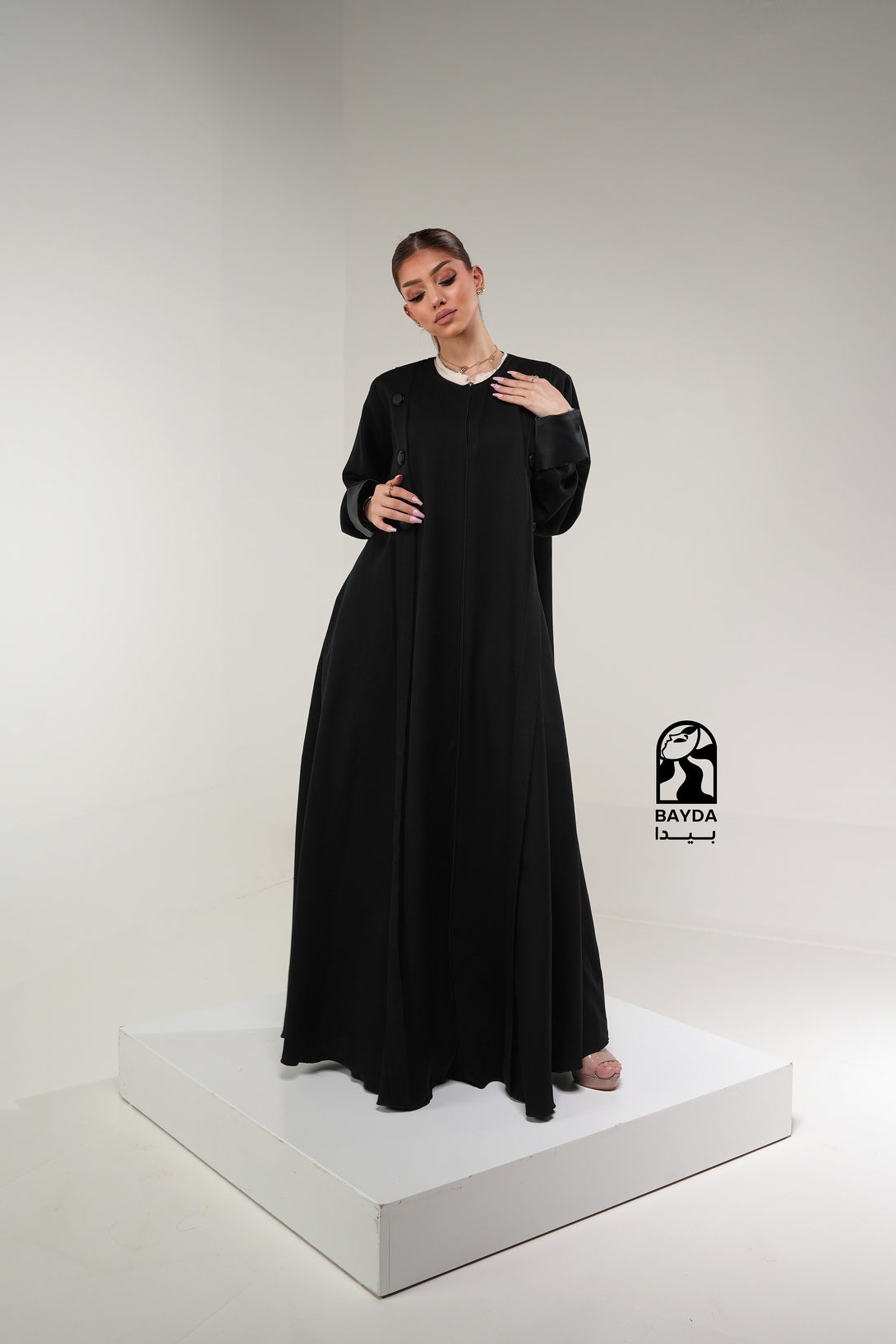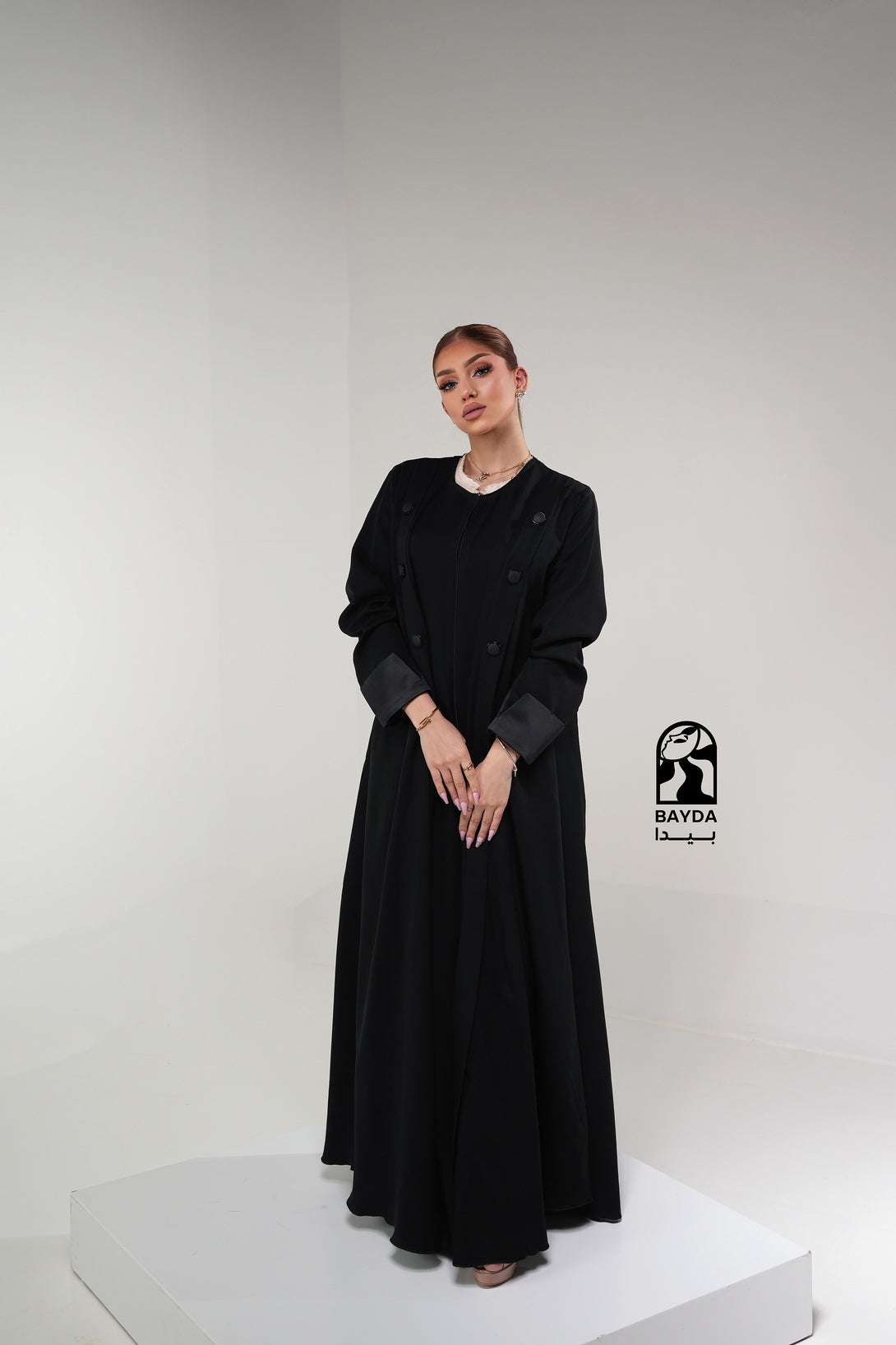 تصميم عصري: تتميز العباية بقَصَّة عملية وراقية مع تفاصيل أزرار على الأكمام، مما يجعلها مثالية للإطلالات الرسمية واليومية المميزة.