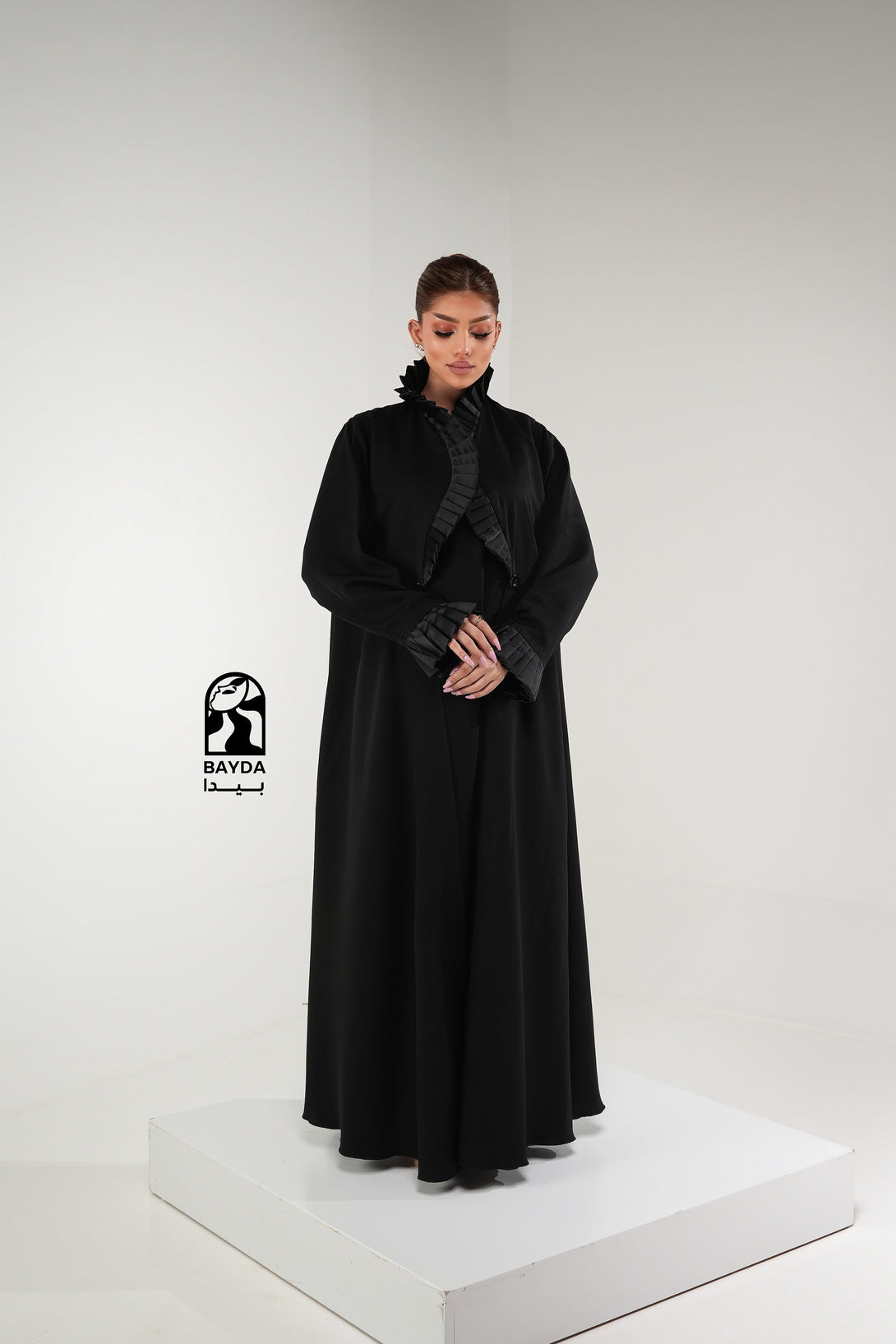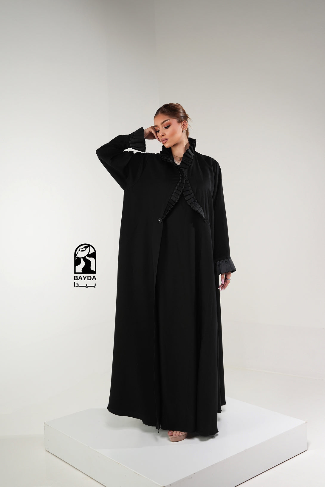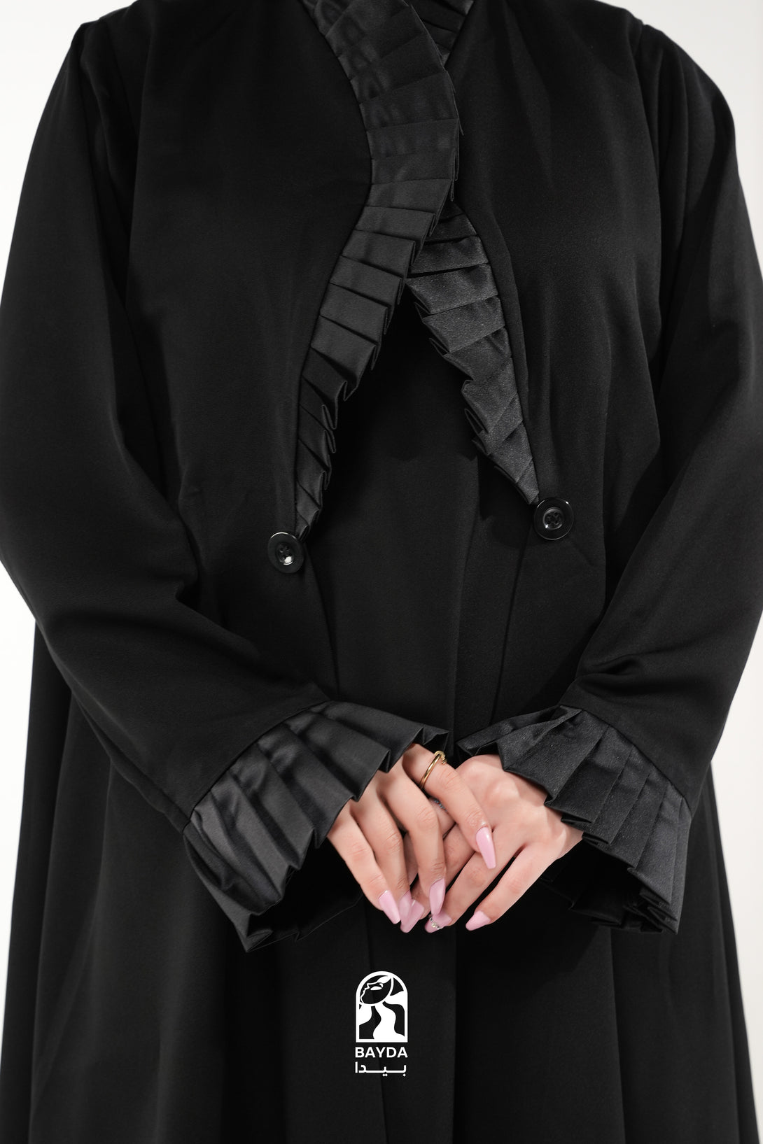 التفاصيل الفاخرة: تتميز العباية بتفاصيل مُتقنة من قماش الحرير المتين على طول الأكمام و قَصَّة الصدر، مما يضيف لمسة من الرقي والتطريز الجذاب.