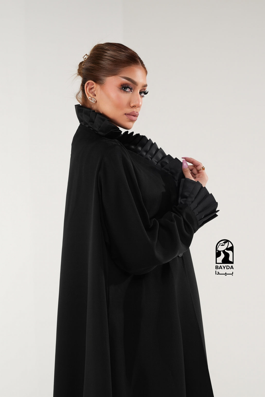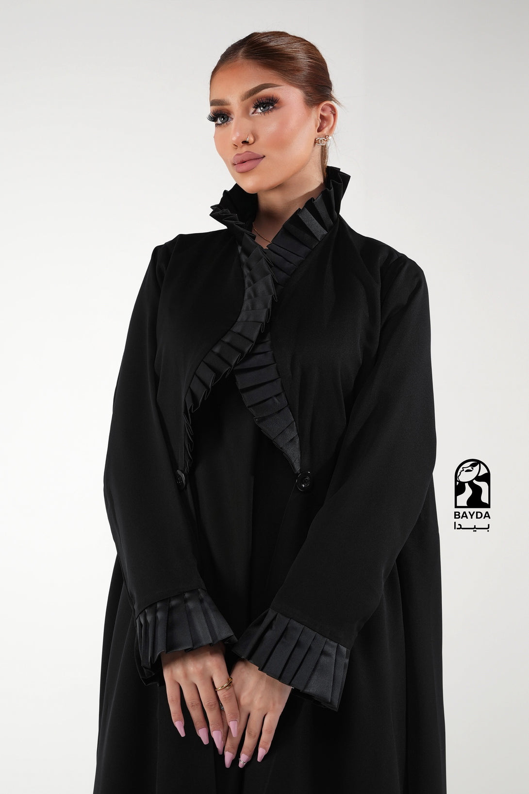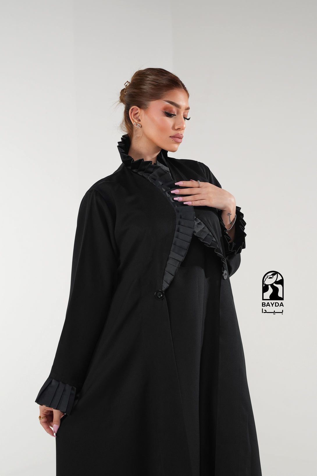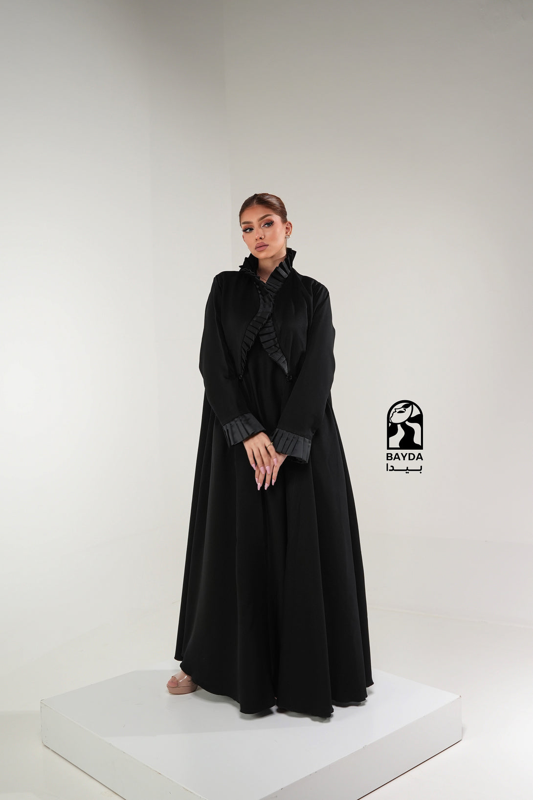 التفاصيل الفاخرة: تتميز العباية بتفاصيل مُتقنة من قماش الحرير المتين على طول الأكمام و قَصَّة الصدر، مما يضيف لمسة من الرقي والتطريز الجذاب.