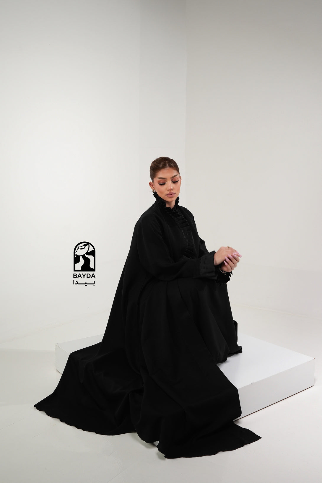 هذه العباية صُنعت ببراعة لتقدم لكِ إطلالة سهرة فاخرة أو مظهرًا مميزًا للمناسبات الخاصة. تجمع بين انسيابية الكريب وفخامة تطعيمات الحرير المتين.